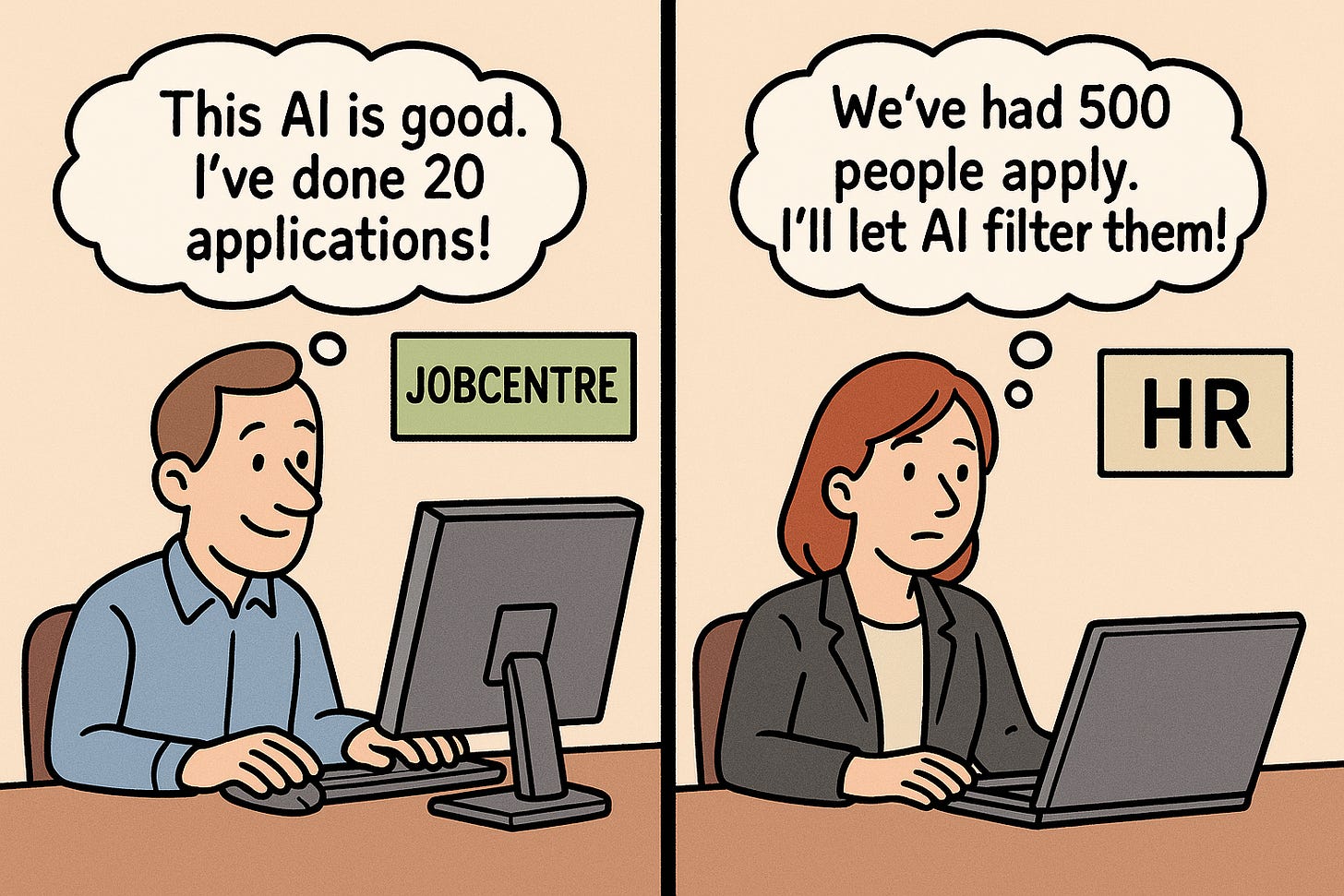 AI applications, filtered by AI recruiters. Unemployed people facing knock-backs and ghosting on a scale that will quickly become quite frightening and depressing.